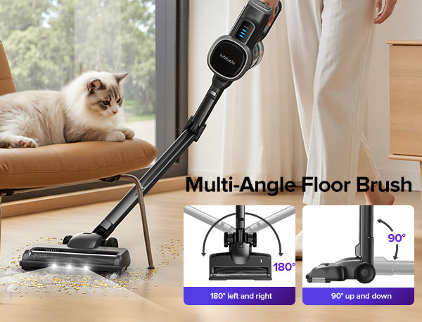 Clean hard-to-reach areas with ease. The brush head rotates 180° left to right and 90° up and down, making it effortless to maneuver around furniture, corners, and tight spaces. Combined with the upgraded anti-tangling V-shaped brush, it ensures deep, efficient cleaning from any angle.