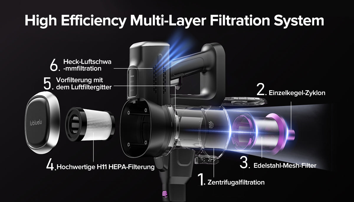 The vacuum uses a high-efficiency multi-layer filtration system that combines centrifugal and cyclone separation with a stainless steel mesh, an air-filter grille, and a top H11 HEPA filter. Together with the tail-end air sponge, it effectively traps fine dust and allergens, delivering cleaner exhaust air and maintaining strong, long-lasting suction.