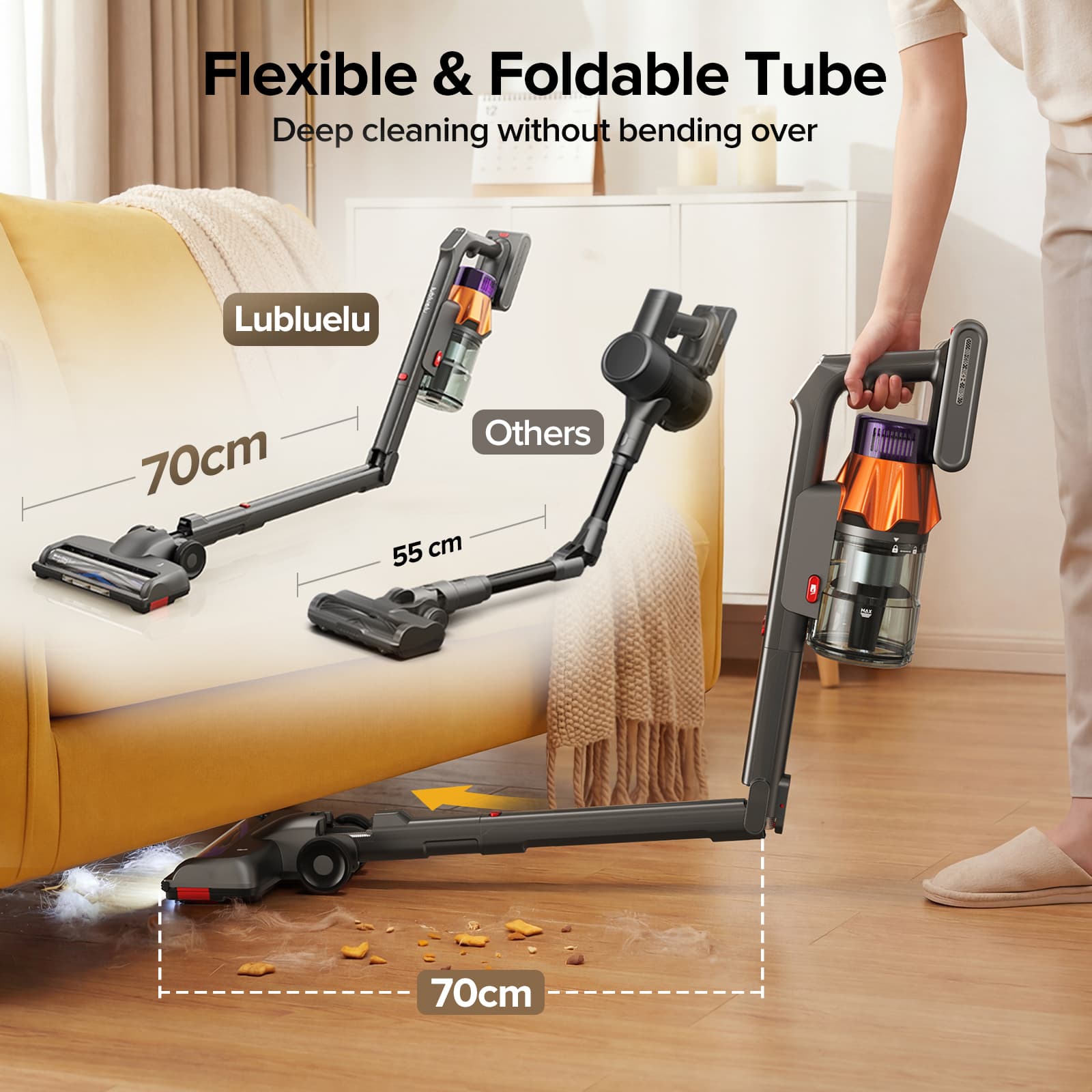 Il design del tubo pieghevole a 90° consente di raggiungere senza sforzo sotto letti, divani e mobili bassi, senza bisogno di piegarsi. Con una profondità di pulizia estesa di 27,56 pollici, polvere e detriti nascosti vengono rimossi facilmente per un'esperienza di pulizia più confortevole ed efficiente.