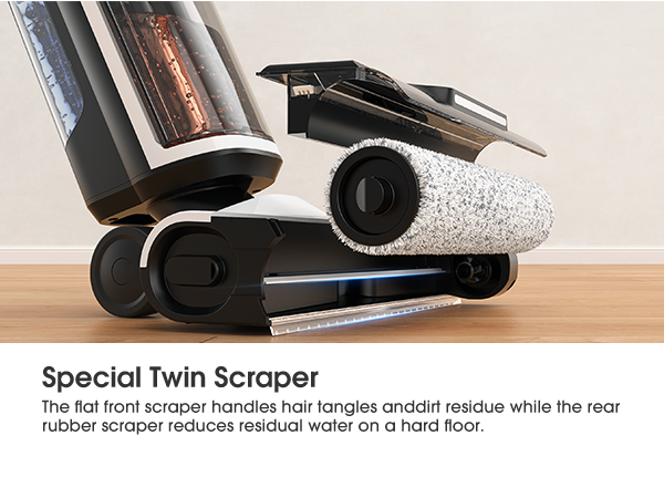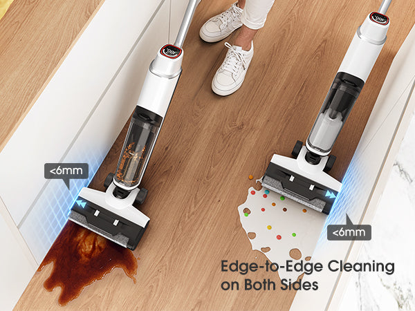 Raccolta completa dei detriti: l'innovativo sistema a doppio raschietto è progettato per la perfezione. Tergipavimento piatto: gestisce efficacemente e previene i grovigli di peli di animali e capelli umani, raschiando al contempo detriti umidi e asciutti. Tergipavimento in gomma: segue la parte posteriore per ridurre al minimo i residui d'acqua sui pavimenti duri, garantendo una finitura senza aloni e ad asciugatura rapida. Pulizia dei bordi fino a 6 mm: il design a basso profilo raggiunge fino a 6 mm da battiscopa e angoli, garantendo che non rimangano residui di sporco sui bordi per una pulizia davvero accurata.