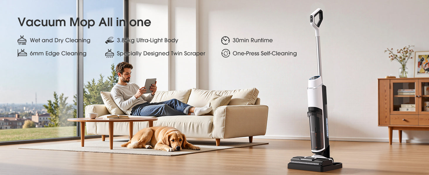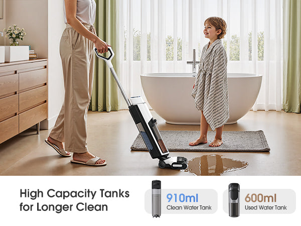Copre tutta la casa: il grande serbatoio dell'acqua pulita da 910 ml e il serbatoio dell'acqua sporca da 600 ml lavorano in sinergia per consentire fino a 30 minuti di pulizia continua, sufficienti per coprire un'area di circa 2000 piedi quadrati (200 m²) senza bisogno di rabbocco o svuotamento. Pulizia ininterrotta: ciò significa che puoi pulire la maggior parte degli appartamenti o interi piani di una casa in un'unica sessione efficiente.