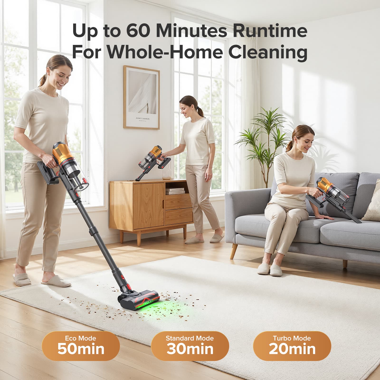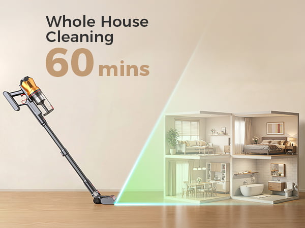 Zaprojektowany do sprzątania całego domu, model G30 jest zasilany akumulatorem o dużej pojemności 7 x 2200 mAh, który zapewnia do 60 minut ciągłej pracy w trybie Eco. Od dużych mieszkań po domy wielopokojowe, sprząta dłużej bez przerw – dzięki czemu możesz posprzątać każdy pokój za jednym razem, bez konieczności zatrzymywania się na ładowanie.