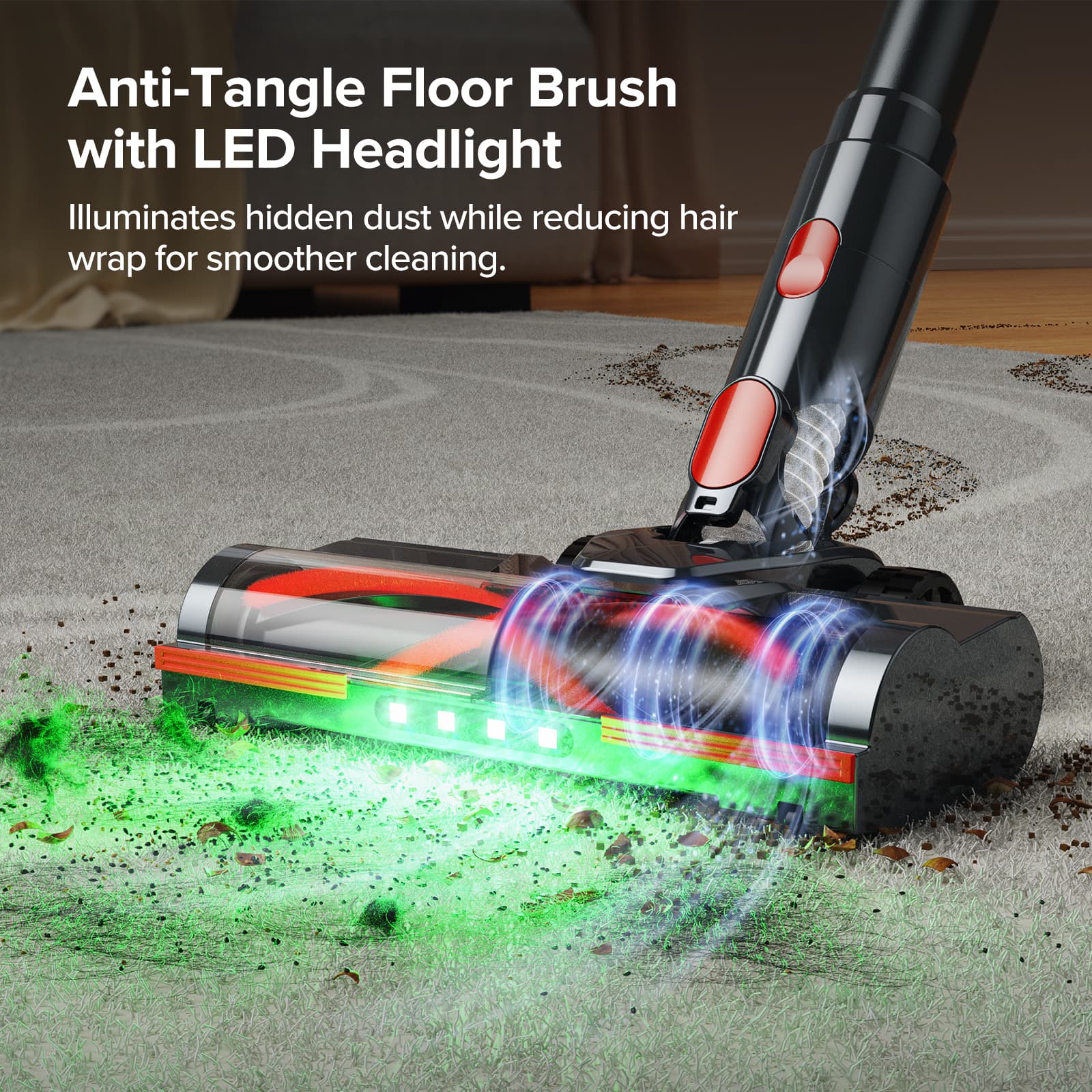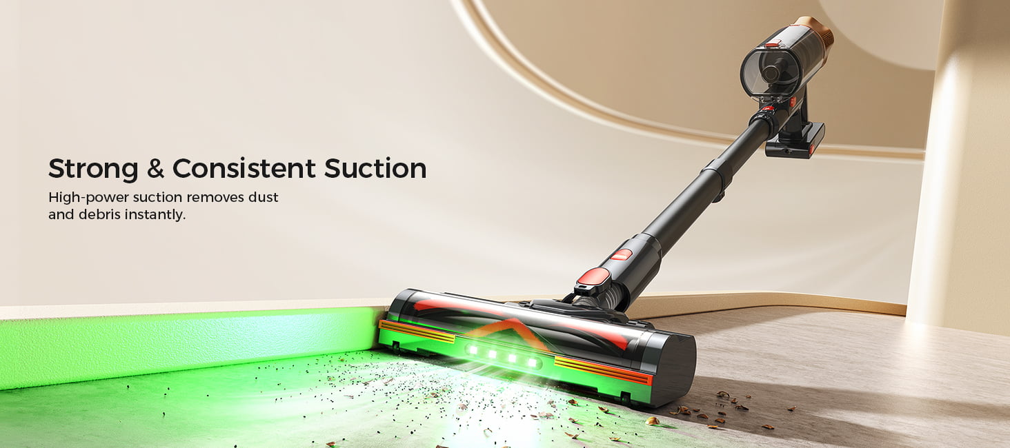 Ulepszona szczotka podłogowa łączy w sobie silnik o dużej mocy i duże rolki, zapewniając płynne i bezproblemowe poruszanie się po dywanach, płytkach, drewnianych podłogach i innych powierzchniach. Wbudowane diody LED oświetlają kurz i włosy w ciemniejszych miejscach, pomagając dostrzec to, co często umyka uwadze. Konstrukcja w kształcie litery V, zapobiegająca plątaniu się włosów, kieruje je bezpośrednio na ścieżkę ssącą, redukując ich plątanie się nawet o 99% – co jest szczególnie przydatne w domach ze zwierzętami lub długimi włosami.