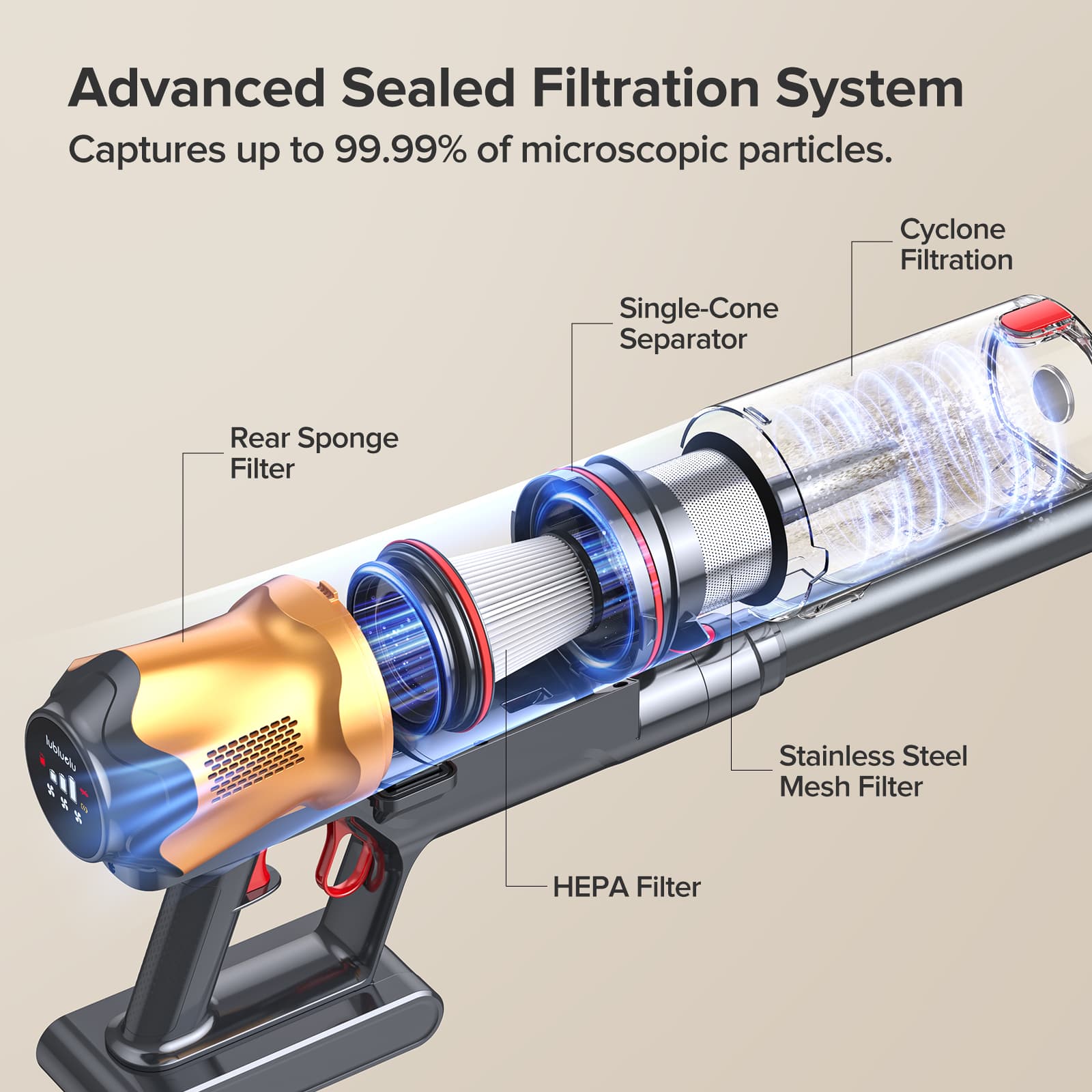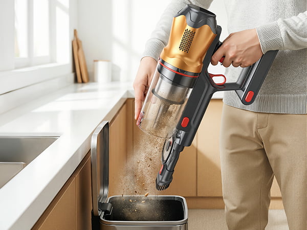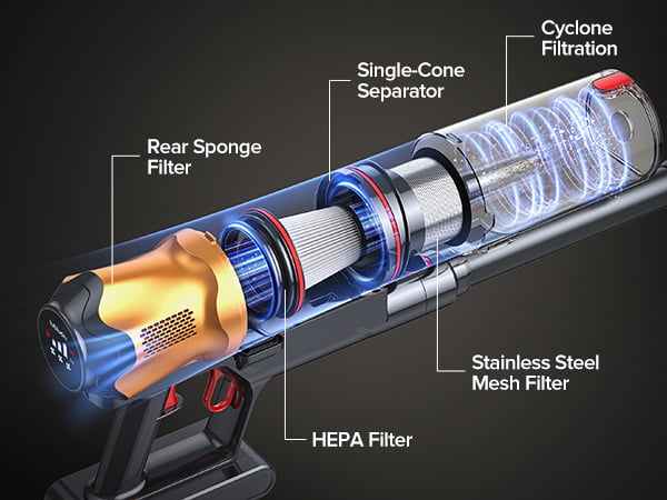 Nasz w pełni szczelny, wielowarstwowy system filtracji wychwytuje 99,99% mikroskopijnych cząsteczek kurzu, nawet o wielkości 0,3 mikrona, utrzymując drobny kurz bezpiecznie zamknięty w środku, zamiast uwalniać go z powrotem do domu. Łącząc separację odśrodkową, technologię cyklonową i wysokowydajne filtry, zapewnia on czystsze powietrze wylotowe i mniejsze zatykanie filtrów – idealne dla gospodarstw domowych z alergiami i dla zdrowszego codziennego sprzątania.