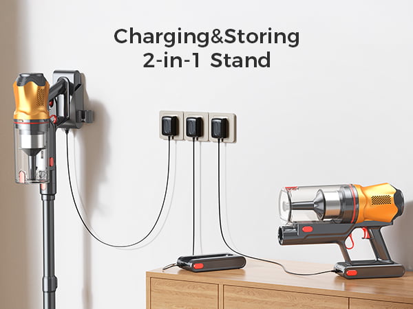 Stojak 2 w 1 pozwala na przechowywanie odkurzacza w uporządkowany sposób i zapewnia jego gotowość do użycia w każdej chwili. Wystarczy go zadokować po użyciu, aby automatycznie się naładował – bez konieczności montażu na ścianie i bałaganu. To czyste, oszczędzające miejsce rozwiązanie, które idealnie wpasowuje się w codzienne życie.